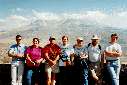 Hans van Halteren, Pam Carlson, Dennis Hoover, Barbara Kolln, Allison Place, Ian Gorlick, and Peter Metcalfe relax in front of Mount Saint Helens.